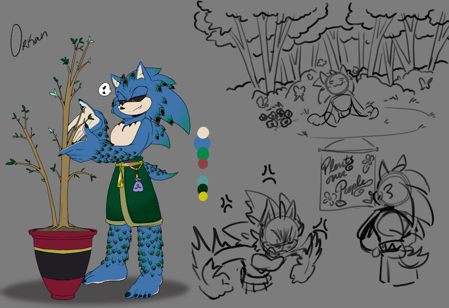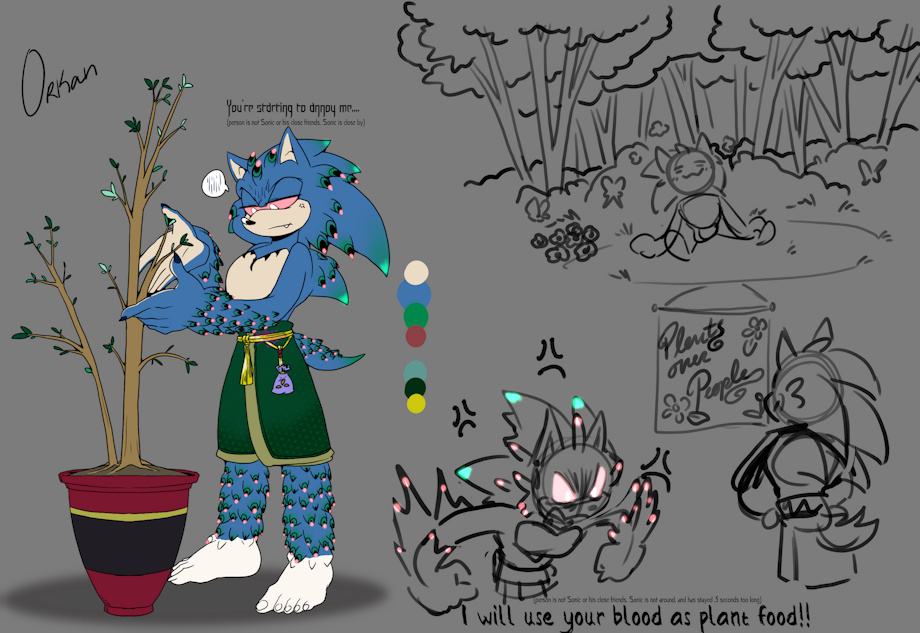 The challenge of raising Orkan is due to his temper. He loves nature but shares his other father's hatred of other living beings. Without Sonic around, Orkan can get increasingly violent if people stay in his presence too long. To that end he makes money by operating a greenhouse, where he can care for plants all he wants and let others handle the money part.