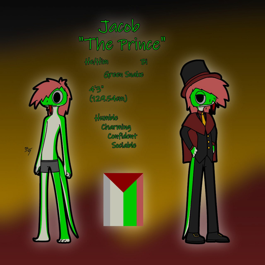 Ref sheet of my little snake man, Jacob. He goes by "The Prince" because he used to be one until he was disowned and sent away. He's still a cool, little, fancy man tho