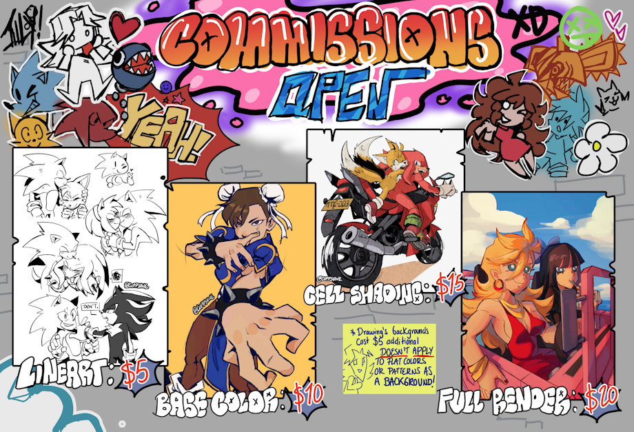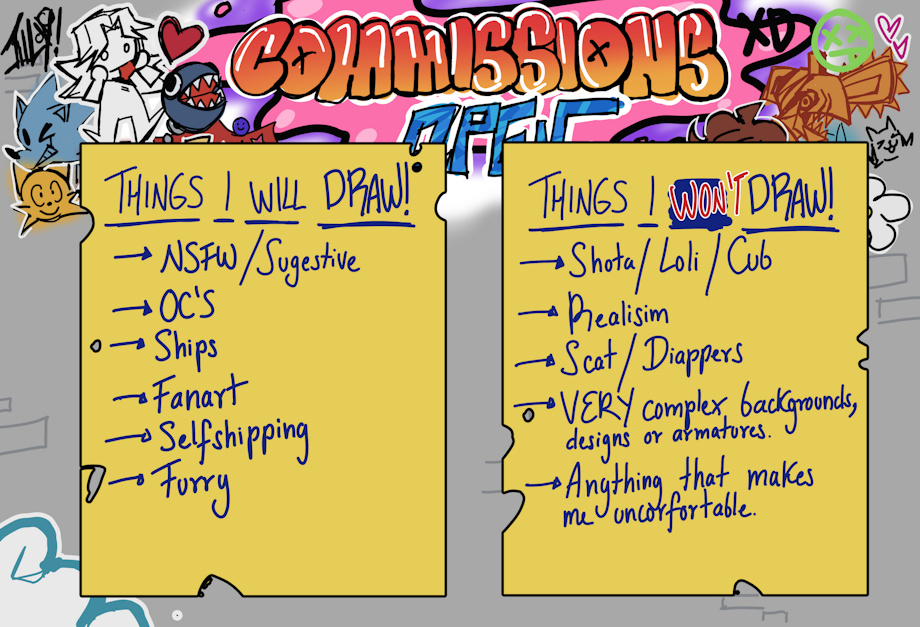 I'm glad to announce You all, I have commissions open! In case you Don't have Discord and you're interested on buying then please send me a Gmail to cuppadonn@gmail.com with your Inkbunny, Twitter or instagram username and the words "Commission request" or related as a subject.