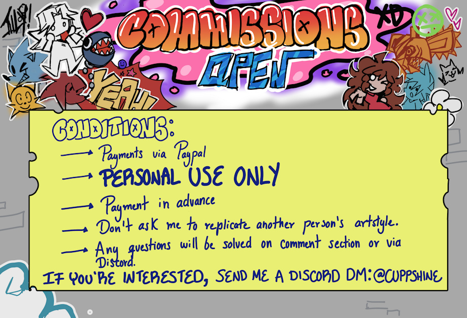 I'm glad to announce You all, I have commissions open! In case you Don't have Discord and you're interested on buying then please send me a Gmail to cuppadonn@gmail.com with your Inkbunny, Twitter or instagram username and the words "Commission request" or related as a subject.
