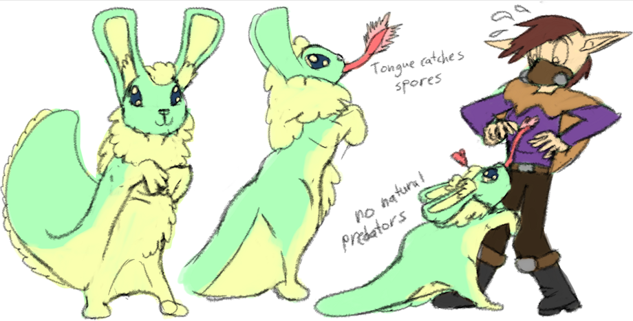 This is the dust-bunny! Native to the lone world, they're most active during the autumn when the mushroom forests release their spores into the atmosphere- A rich source of nutrients to anything that has the tongue to catch them. They will also enjoy the smaller fruit or bug to supplement their diet outside of the season.