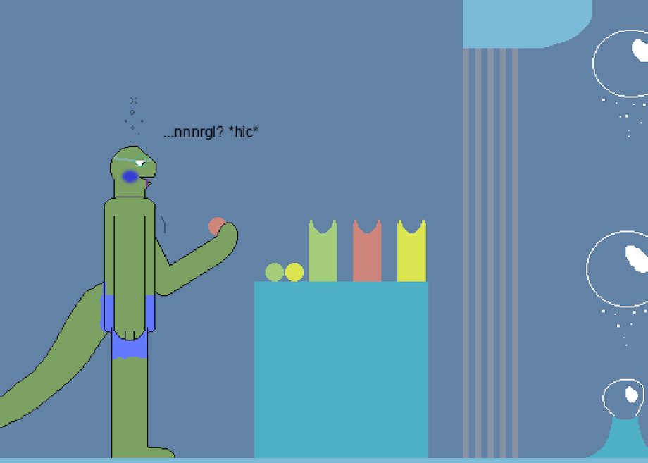 Something strange rushed into his nostrils, and he coughed, noticing a cluster of bubbles floating free and ascending toward the sky. Was he starting to lose control of the dream? He tried to breathe again, but it happened again, and the lizard started to feel like he was choking. What was going on!?