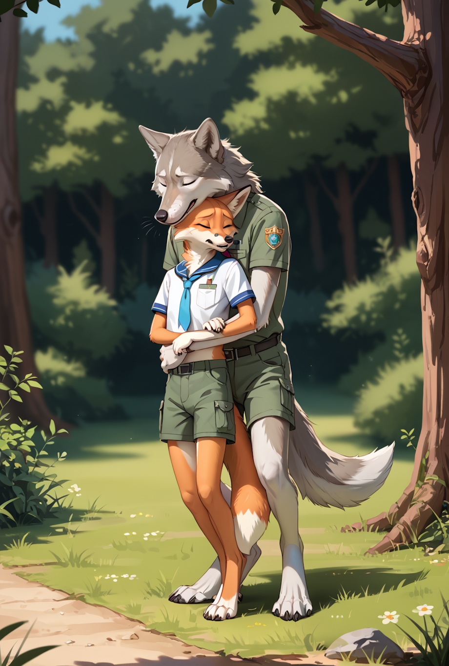 Savoring the fox's affection, the wolf's paw rubbed the fox's back, focusing around the fox's hips and cute butt. Tiki responded by nuzzling against the wolf's neck more.