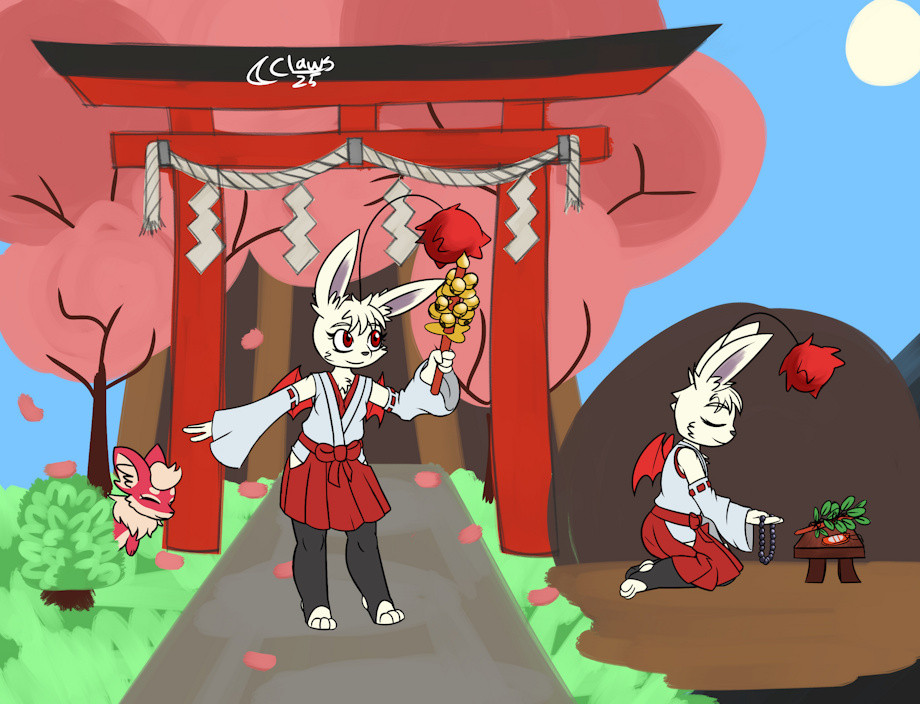 Here Neuge is cosplaying as a miko for a shinto shrine. You can see a little fox spirit helping her too. Something I was inspired to do. This is actually an old pic from December I never felt like posting, but here it is.