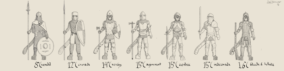 I tried to hit the high points of major armor developments and changes while picking armors that all looked fairly unique. Vendel feeds Viking/Hastings era, but does not change dramatically. 13thC sees coat of plates appear, but you can just add some dots to the front of the tabard in your head. It's not until the 14th-15thC before armor really starts changing wildly.