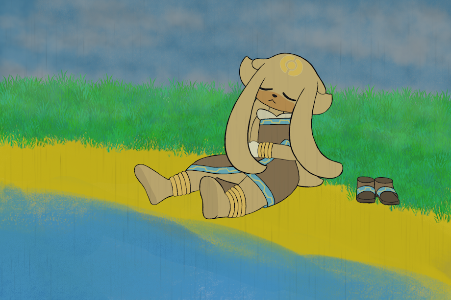 I was feeling sad and wasn't able to do much so I decided to draw a more atmospheric piece, so here's Gold sitting on a lake beach in the rain taking in the elements. I have to imagine a more natural scene like this and downtime to her is more unnatural to her so she's taking in the surroundings for all they're worth.