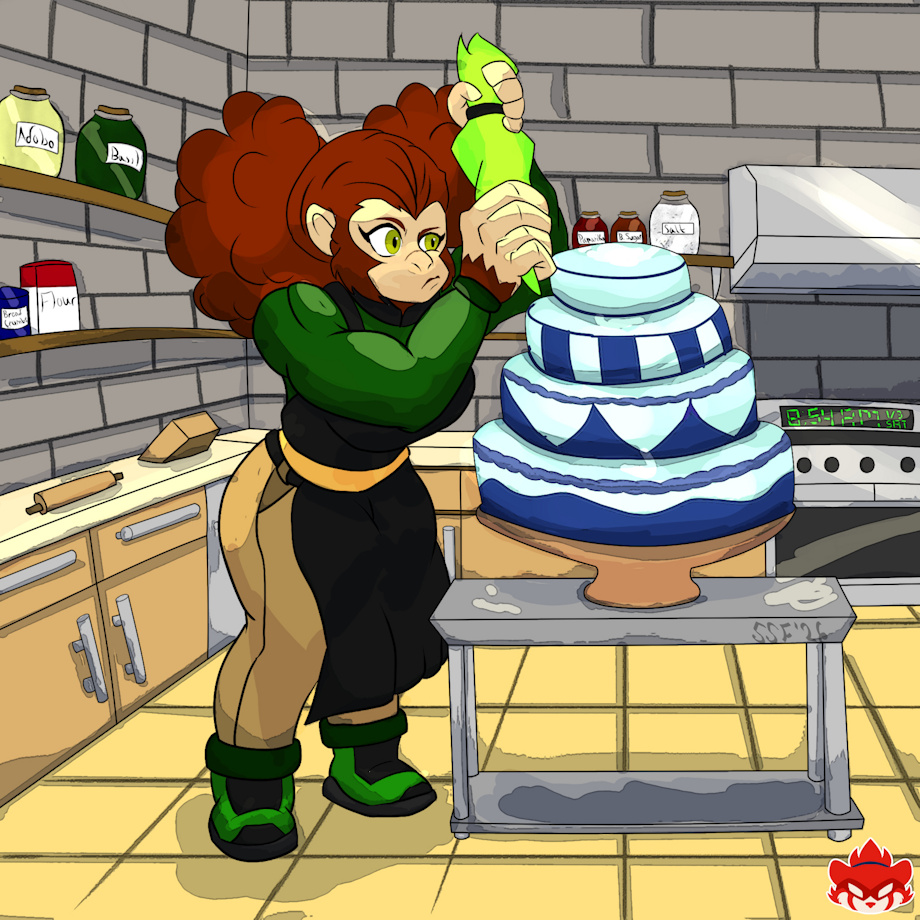 Really trying to up my background game this year. Here Sazanka is decorating a cake for a local event. So glad to finally redraw her. Maximum Effort.