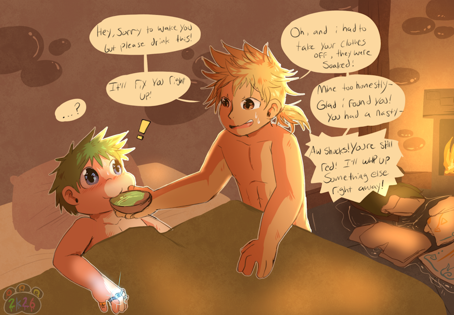 So, i had him bring a possibly collapsed Milio in from the rain, and he takes Milios and his own clothes off so he also dosent get sick, and quickly whipped Milio up a tonic to help him through his sickness