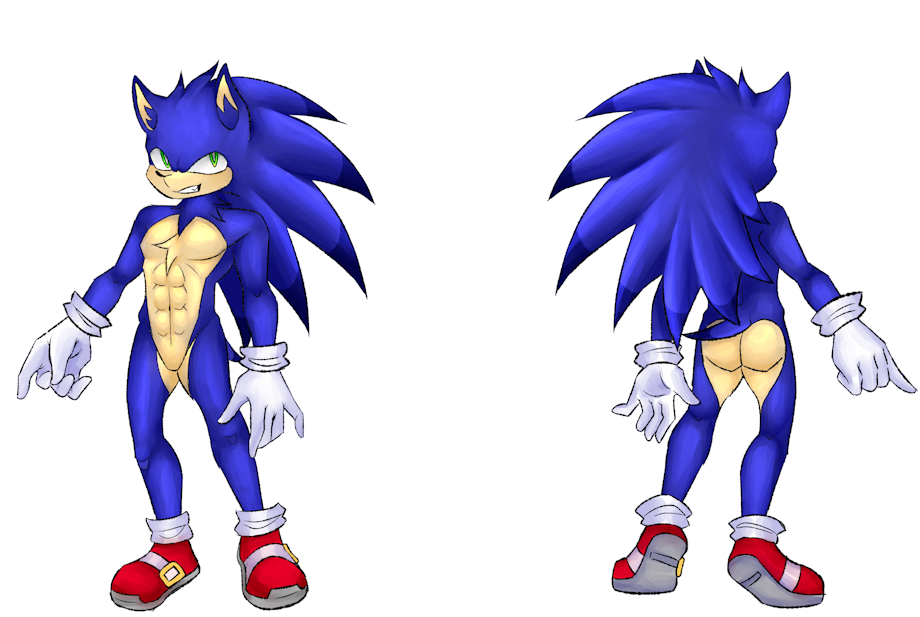 In the first image we have Sonic completely naked but in a SFW version so as not to harm those sensitive to this content, he underwent some modifications, now he has darker spikes at the tips of his hair and tail, and as an added detail, his peach-colored fur has been extended through the groin and reaching the butt, a bold and original design change.