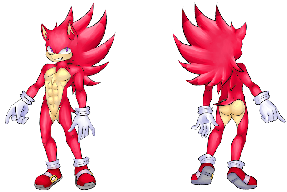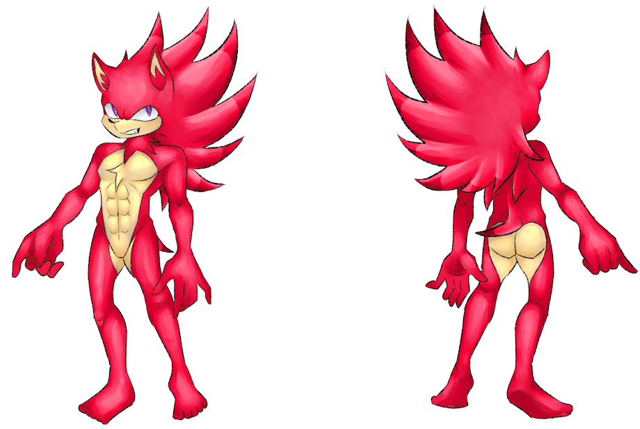 In the first image we have Sonic completely naked but in a SFW version so as not to harm those sensitive to this content, he underwent some modifications, now he has darker spikes at the tips of his hair and tail, and as an added detail, his peach-colored fur has been extended through the groin and reaching the butt, a bold and original design change.