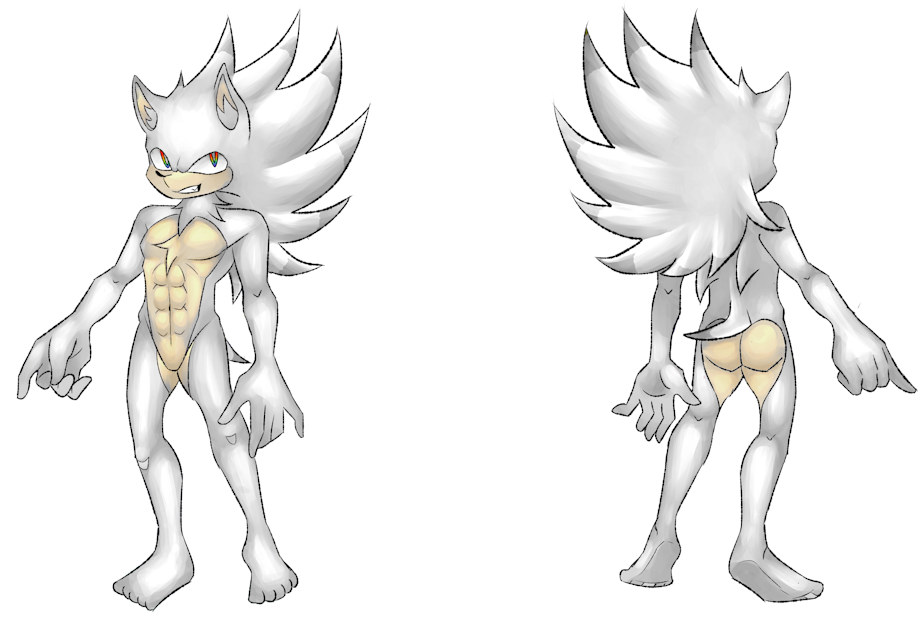 In the first image we have Sonic completely naked but in a SFW version so as not to harm those sensitive to this content, he underwent some modifications, now he has darker spikes at the tips of his hair and tail, and as an added detail, his peach-colored fur has been extended through the groin and reaching the butt, a bold and original design change.