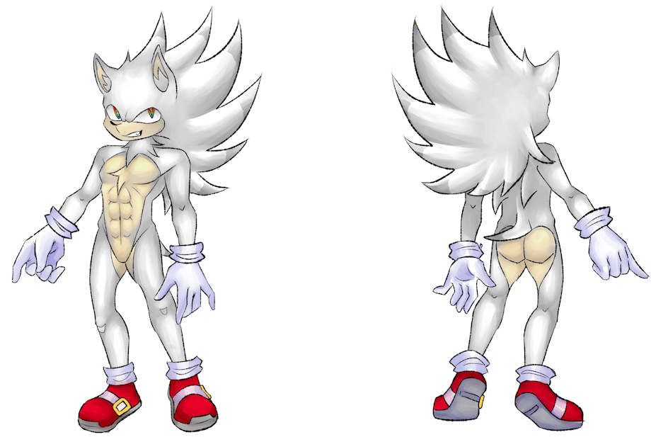 In the first image we have Sonic completely naked but in a SFW version so as not to harm those sensitive to this content, he underwent some modifications, now he has darker spikes at the tips of his hair and tail, and as an added detail, his peach-colored fur has been extended through the groin and reaching the butt, a bold and original design change.