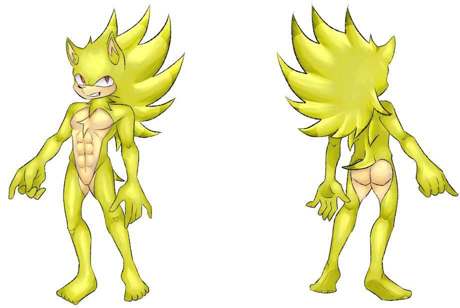 In the first image we have Sonic completely naked but in a SFW version so as not to harm those sensitive to this content, he underwent some modifications, now he has darker spikes at the tips of his hair and tail, and as an added detail, his peach-colored fur has been extended through the groin and reaching the butt, a bold and original design change.