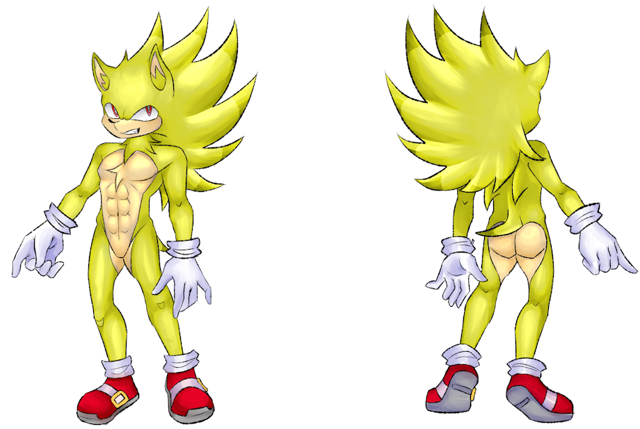 In the first image we have Sonic completely naked but in a SFW version so as not to harm those sensitive to this content, he underwent some modifications, now he has darker spikes at the tips of his hair and tail, and as an added detail, his peach-colored fur has been extended through the groin and reaching the butt, a bold and original design change.