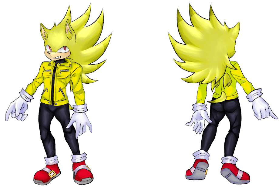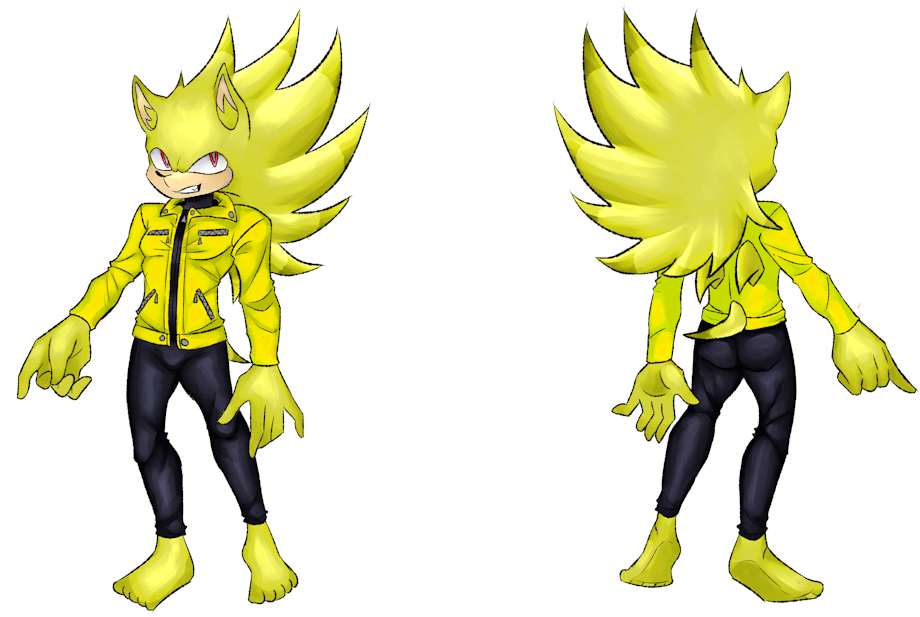 This is Super Sonic, the classic union of the hedgehog with the seven chaos emeralds, his spike color is yellow and his eye color is red, as an addition of mine, the reason he turns yellow is due to a dormant power to control yellow lightning.
