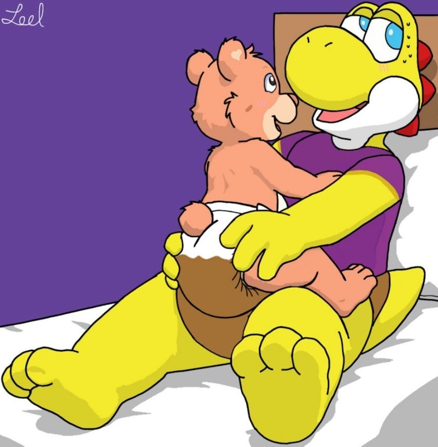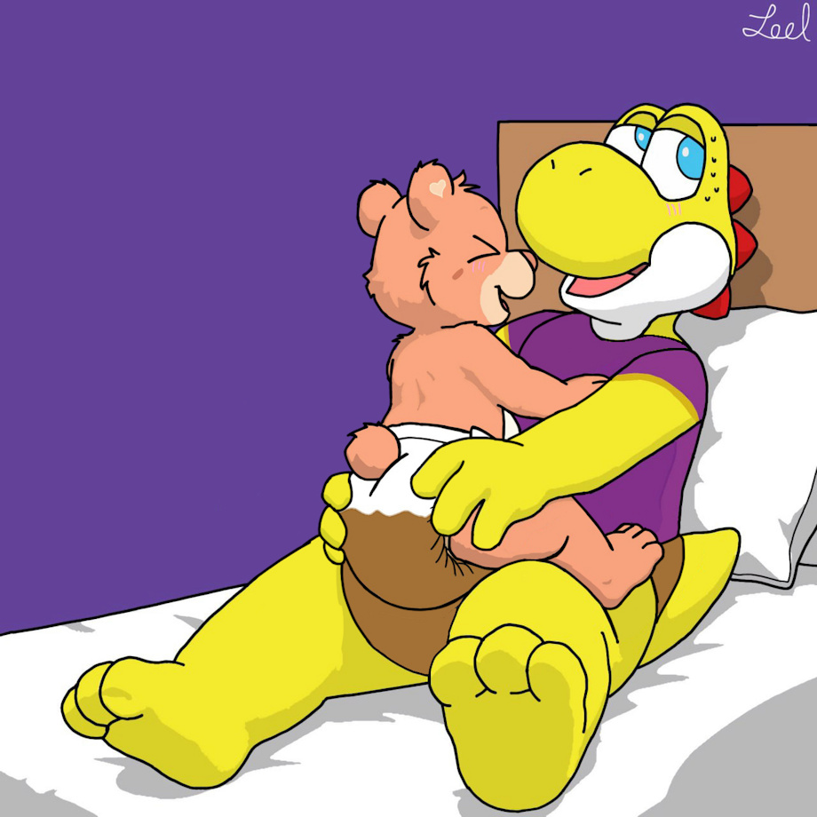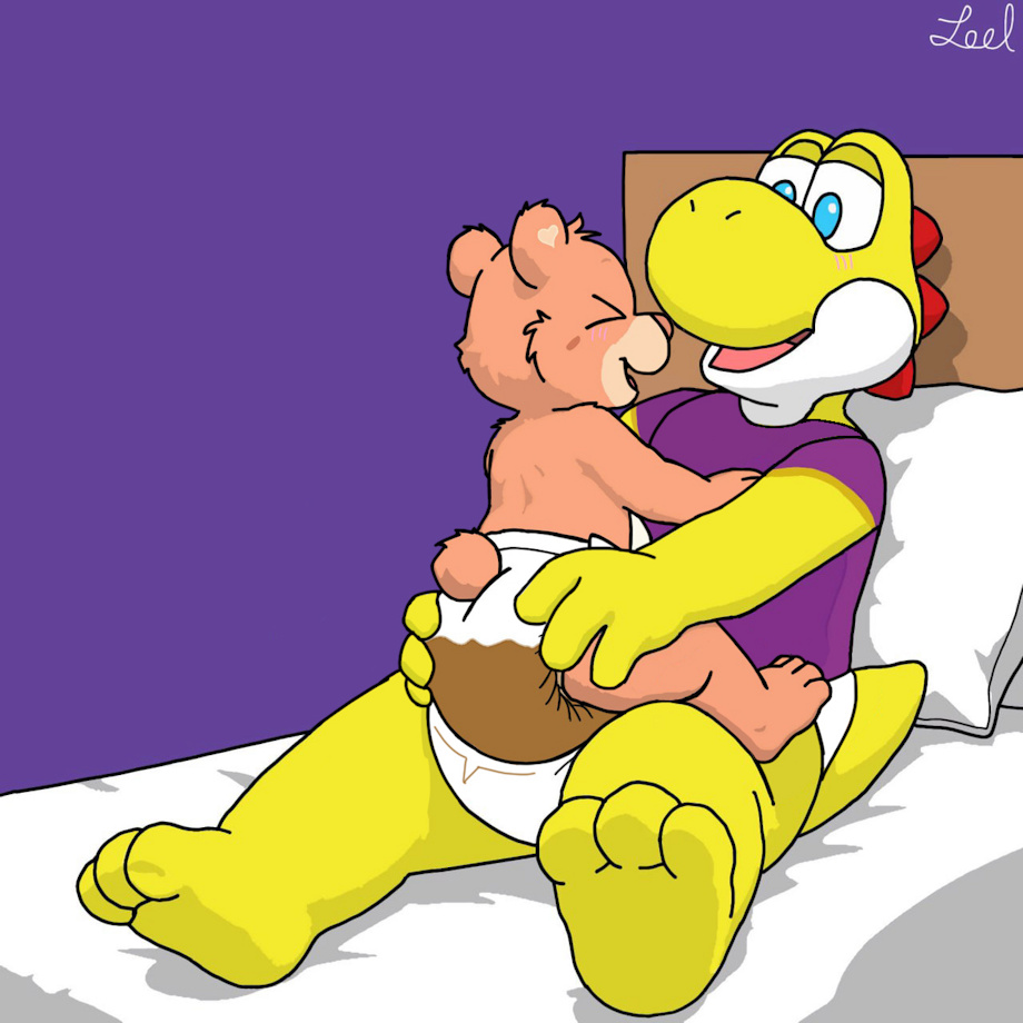Showtime snuggling with Baby Hugs, when she suddenly fills her diaper, along with Show filling his right afterward.
