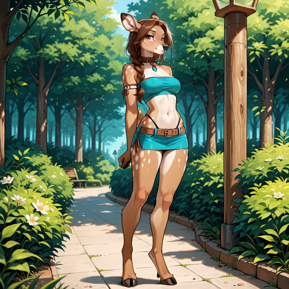 Female, anthro, doe, no horns, hazel eyes, long brown hair with single braid, tribal, medium breasts, collar, deer feet, tube top, micro miniskirt, thong,