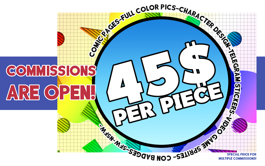 COMIC PAGES (FULL COLOR PAGES, UP TO 6 PANELS AND 3 CHARACTERS PER PAGE) FULL COLOR PICS (BACKGROUND OPTIONAL, UP TO 3 CHARACTERS PER PIC) CHARACTER DESIGNS (BASIC FULL BODY, FULL COLOR DESIGN) TELEGRAM STICKERS (BASE PRICE PER STICKER, SPECIAL PRICE FOR MULTIPLE STICKERS PACKS)