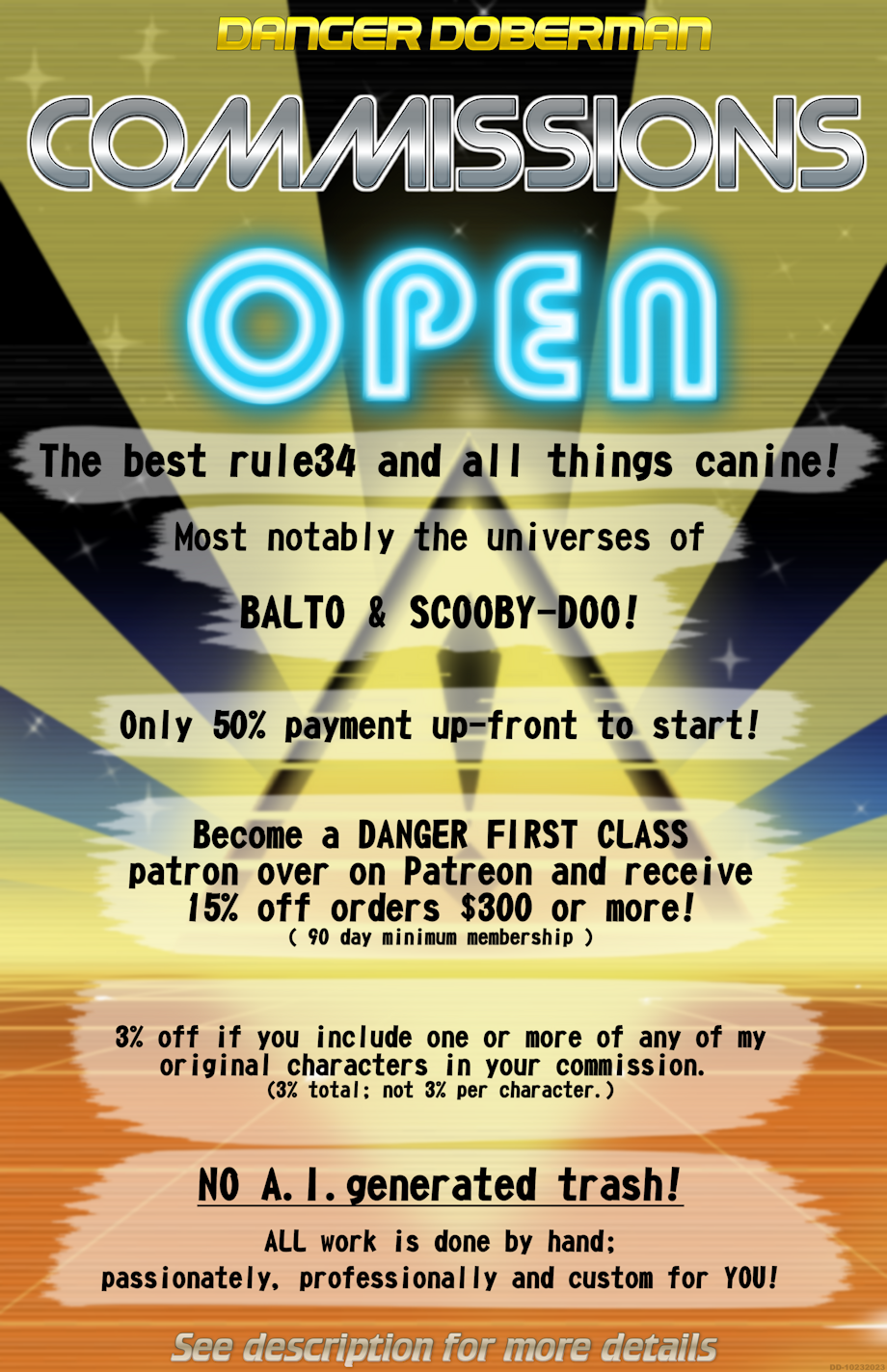 - No humans (trying to work more with anthro and feral dogs). Humans can be implied in the work, but shouldn't be seen at all unless it's a SFW piece. However...human shaped dildos are allowed.