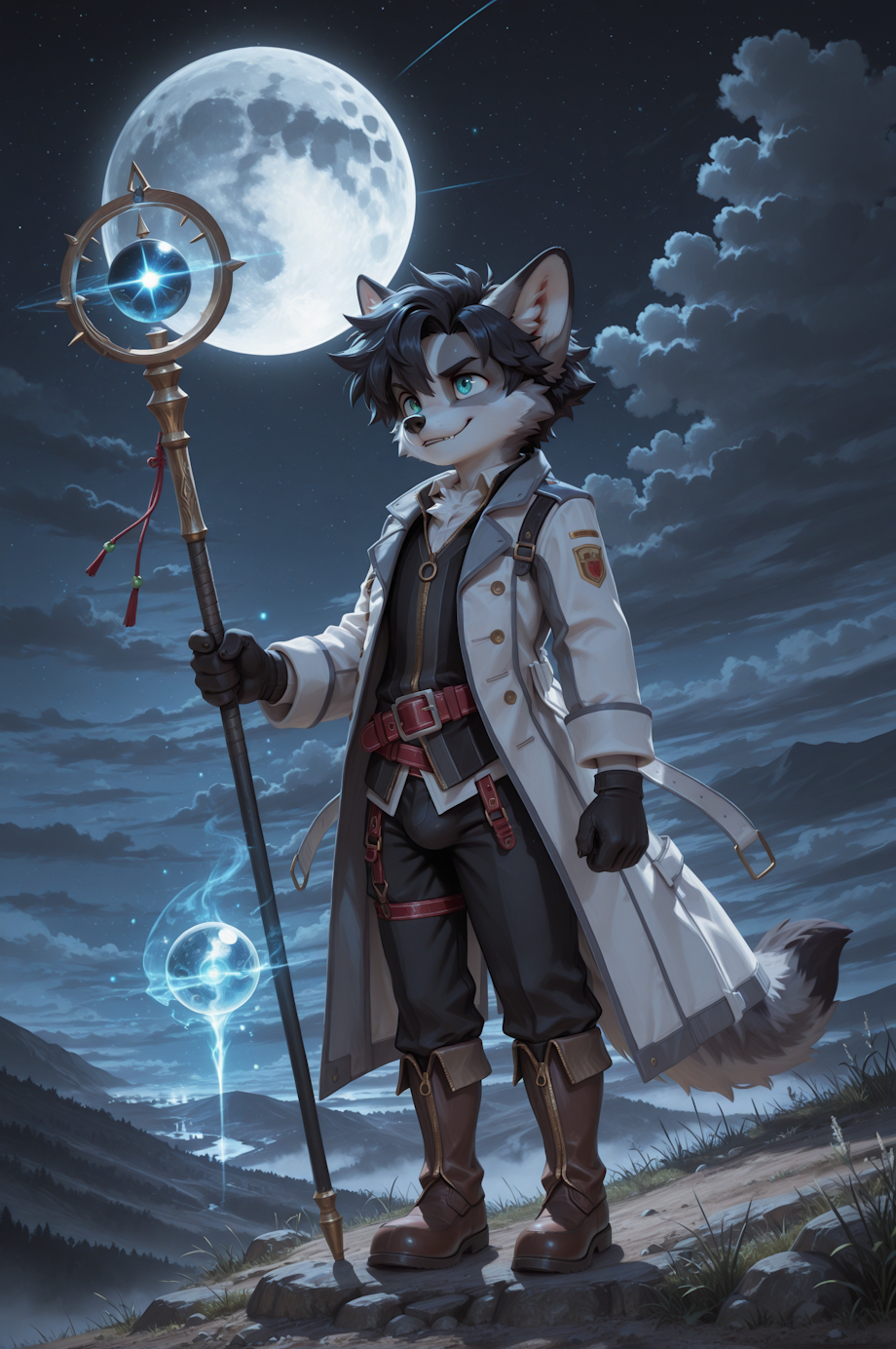 His tail flicks behind him like a warning flare in the darkness. In his hand, he grips a katana with the blade catching the moonlight as if it’s hungry for motion. The misty forest around him glows silver under the full moon, pagodas rising in the distance like ancient sentinels watching over his mission. Kenji looks like a warrior carved from night, silent, precise, and ready to strike.