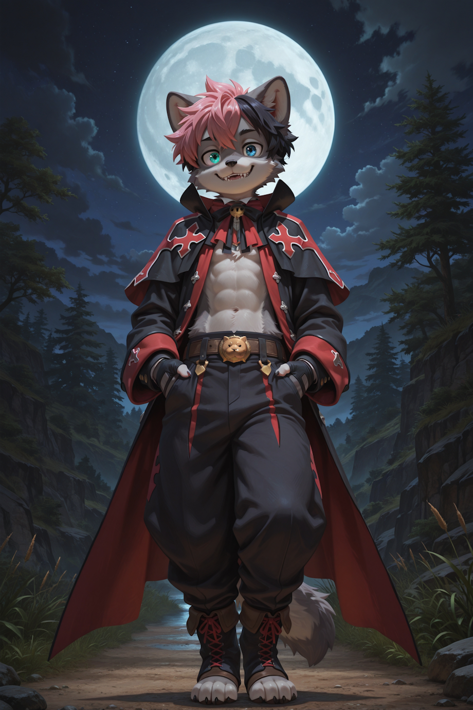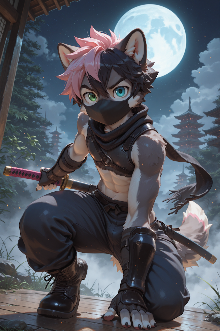 Kenji crouches low in the moonlit forest, a shadow sharpened into form. His wolf‑like silhouette is wrapped in a sleek ninja‑style outfit, a sleeveless black top, fitted arm guards, and dark tactical pants tucked into heavy combat boots built for silent movement. A black mask hides the lower half of his muzzle, leaving only his eyes, one green, one blue, glinting with focused intensity beneath his pink‑and‑black hair.