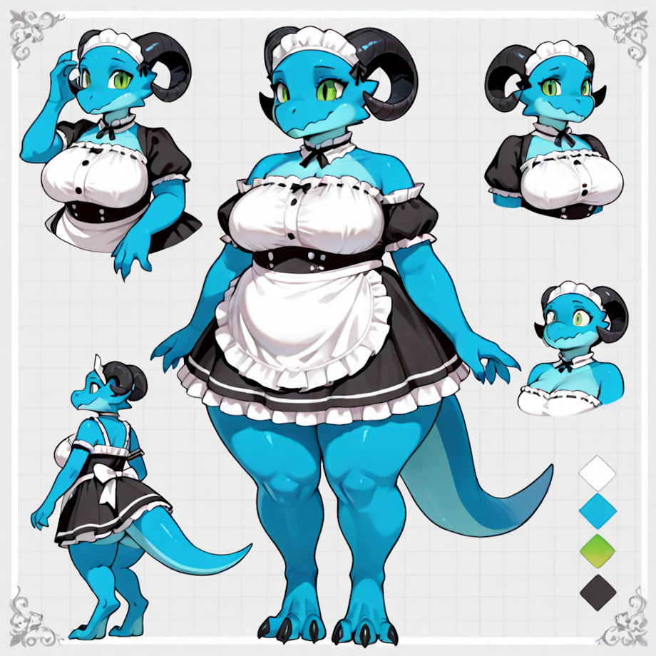 (Kobold, female, short, fat, large breasts, blue skin, green eyes, inward curled horns, black horns, full body, maid outfit, short black skirt, frilly button up white top