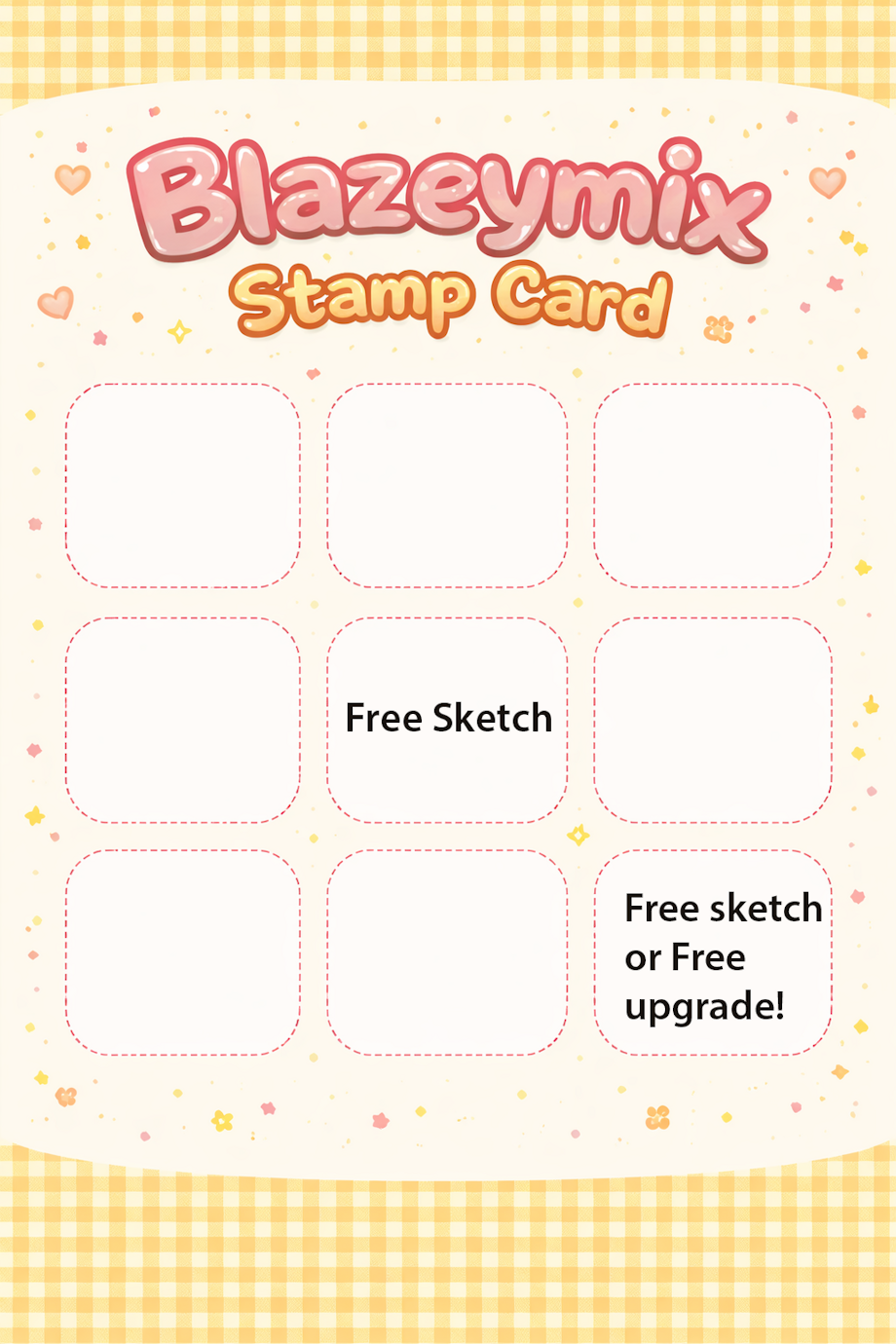 Hey folks! I'm doing a cute new thing to say thanks to my commissioners by giving them a stamp card like this one! Each commission earns one stamp, and if it's a bigger commission.. you get two stamps! Earn enough stamps and you get some free goodies :)