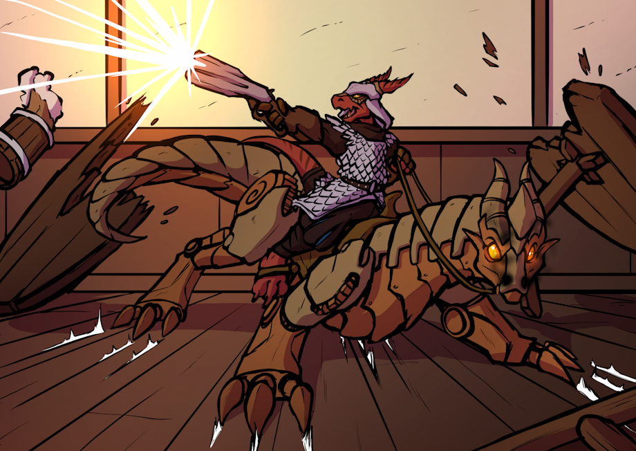 Sekbe, the crafty inventor, breaking up a barfight between his friends and some shady goons.