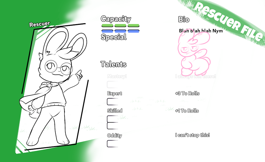 Since it was meant to be a really simple game played with a dice roll bot in Discord, the rules and character sheets were also really simplified, You and your rescue team would run into hazards and encounters that presented a simple dice roll check and you'd have to figure out some way explain how you'd use your best skills to deal with it, (or just straight up risk getting blown up with no advantages)