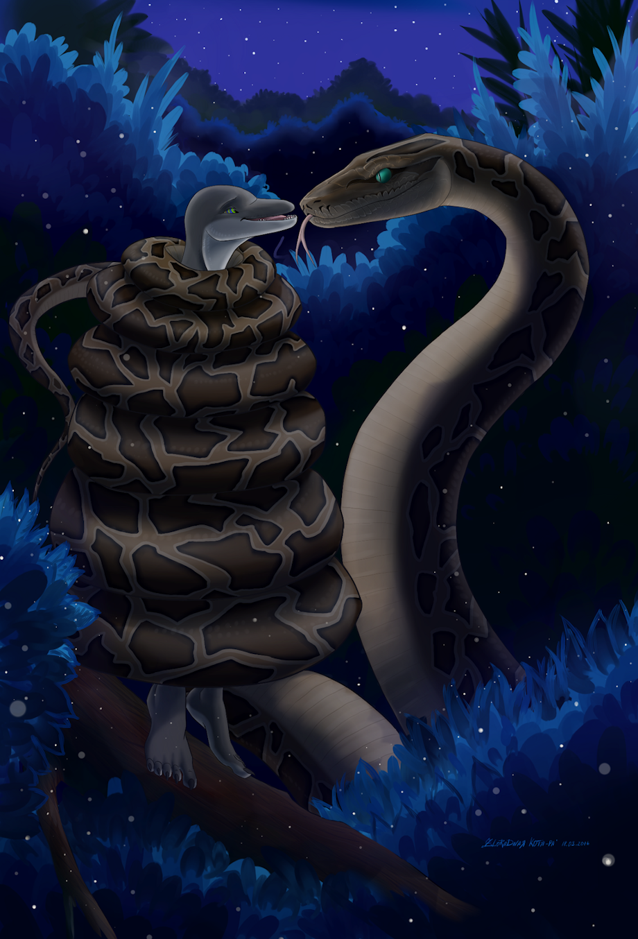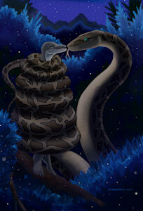 "I saw that you were having trouble sleeping. Don't worry, I can help you with that." Kaa said to the dolphin. Down below the branch Najal is on, Kaa's tail was moving up from there and it was coming closer to him. Kaa began wrapping her coils around him starting with his ankles and then began wrapping up his legs.