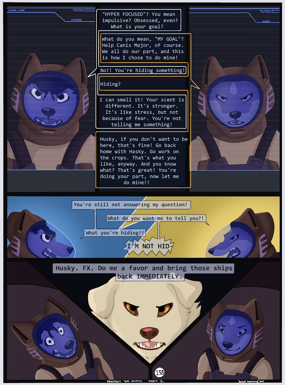 "Husky finally confronting Fx about his strange behavior, leading to him joining the D.E Development Team as a test pilot. But Fx doesn't seem to be budging. Husky knows him very well, but maybe he really isn't hiding anything. Or maybe he is... Too bad they just got caught."