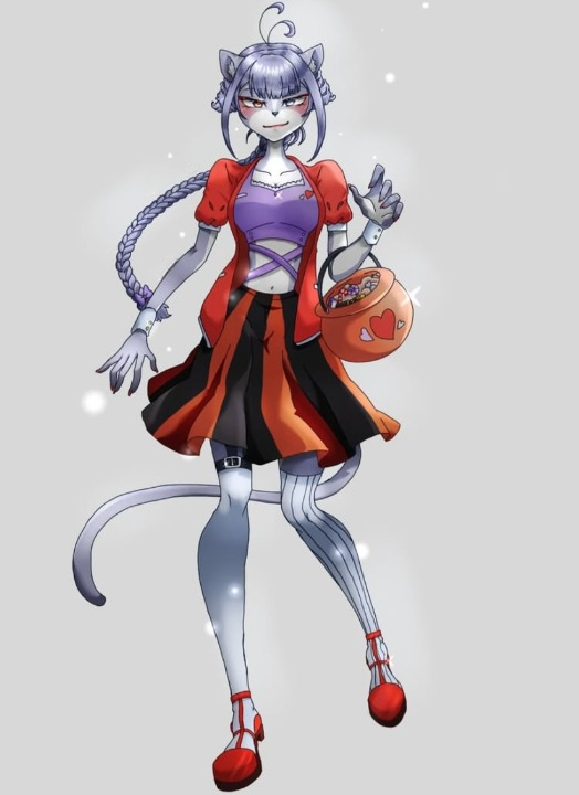 A mischievous cat-girl with a sharp grin and a playful, dangerous charm. She walks the line between cute and chaos, always one trick ahead