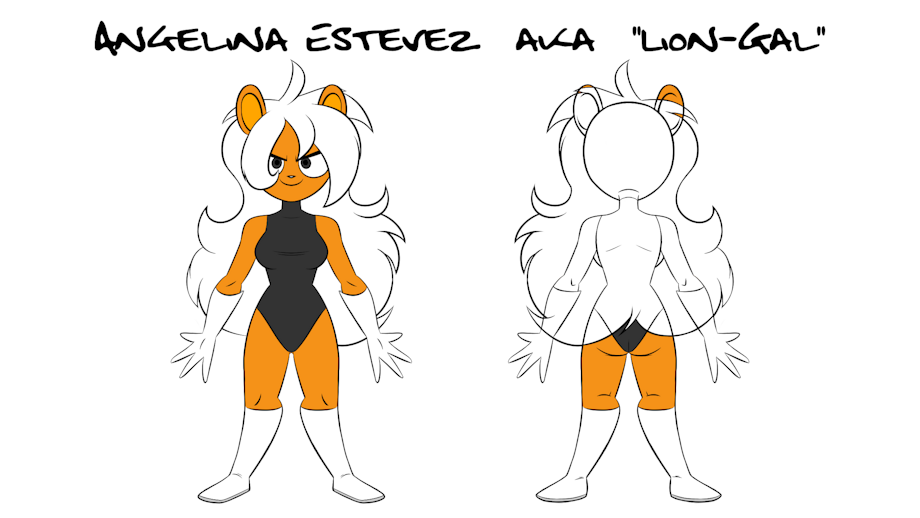 ----- Appearance As a child, Angelina had wild, curly black hair usually tied into a ponytail and hazel eyes. She had lightly tanned skin and stood about 4'5", presenting a shy, girlish demeanor. She wore overalls, cutesy dresses, and floral tennis shoes. As a teenager, she grew to about 5'3" and adopted a rougher tomboy style: bright-colored T-shirts, ripped jeans, and green sneakers. She often straightened her hair through treatments. Lion-Gal Form As Lion-Gal, short orange fur covers her athletic yet curvy body. Her eyes become feline with a yellow-green glow. Her hair grows long and wild down to mid-thigh, thick and curly. Slightly protruding canines show over her lips, and her human nose becomes a small black feline nose. Cat ears emerge from a large white mane atop her head.