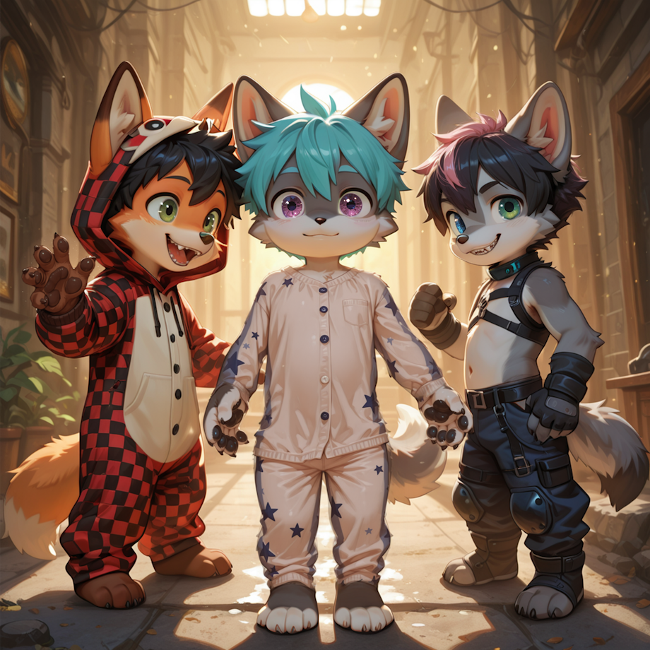 Behind him came Tuxley, the wolf with teal hair that never quite behaved. He wore his favorite star‑patterned pajamas, sleeves too long, expression still half-asleep. Tuxley had the calmest presence of the three, the kind of calm that made even a cold hallway feel like a blanket.