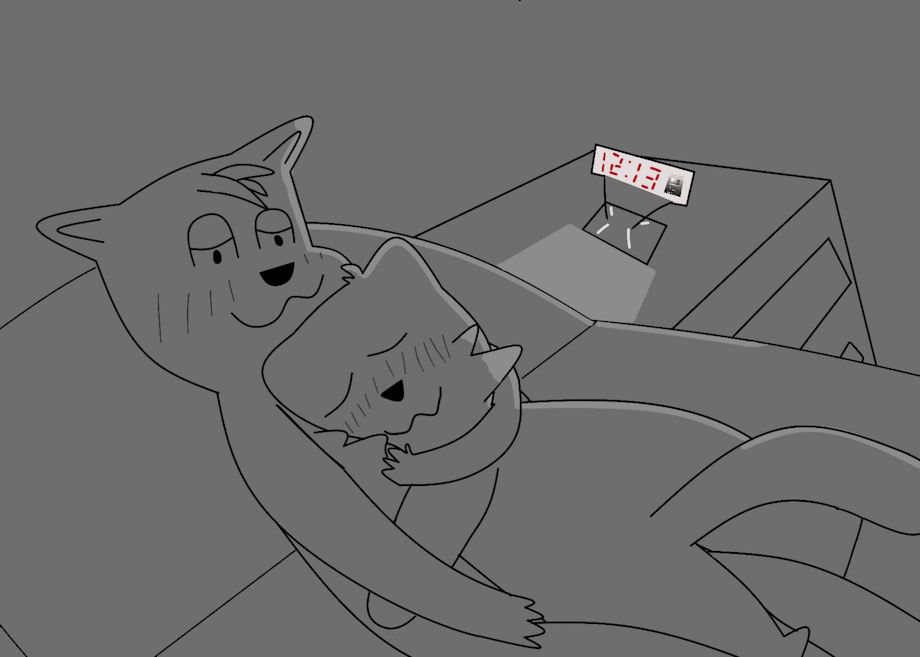 Oxani the red panda in the bed with another anthropomorphic character (both male) in the bed snuggling with their arms wrapped around their self with Oxani hugging him whilst asleep as a hologram clock is on the top right.
