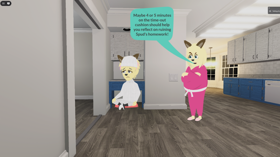 Chip tries to finish Spud's homework but ruins it. In this picture, she ends up in the timeout cushion for 4 minutes (1 minute per year of age) as a punishment prior to apologizing to Spud for ruining his homework.