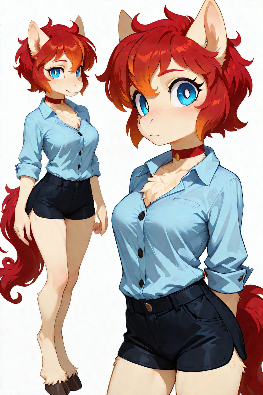 HYPERREALISM, masterpiece, high quality, detailed fur, high detail, 32k_uhd, fine details, intricate details, highest quality, perfect anatomy, perfect face, detailed face, detailed eyes, perfect eyes, very aesthetic, concept art, masterpiece, best quality, amazing quality, ultra-HD, high resolution, ultra-detailed, absurdres, highly detailed, detailed eyes, source_furry, no lineart <lora:(1) FenrisXL Lighting:1> <lora:(1) Mjölnir (SDXL Lighting):1> <lora:photorealistic anthro 2:1> furry (solo, 1girl:1.4) (uncertain, button down shirt, black shorts:2) <lora:character_Sheet_XL:0.8> character sheet, Multiple views, simple background multiple expressions, different emotional expressions, looking at viewer <5k713r> (female:anthro:slim:ponyta:1.7), (medium breasts:1.4), (red hair, orange highlights, chest tuft:1.3), (blue eyes, black pupils:1.3), (short hair, red hair, pixie bob, hair to the side:1.3), (hooves:1.3), (red choker:1.8), (horse girl:1.2), (white skin:1.3), (red tail:1.3), (white nose:1.3), (pubic hair:1.3), (clothes:2) Negative prompt: bloodshot eyes, arms behind back, hands behind back, blurry, blurry background, bad anatomy, bad hands, three hands, three legs, bad arms, missing legs, missing arms, poorly drawn face, bad face, fused face, cloned face, worst face, three crus, extra crus, fused crus, worst feet, three feet, fused feet, fused thigh, three thigh, fused thigh, extra thigh, worst thigh, missing fingers, extra fingers, ugly fingers, long fingers, horn, realistic photo, extra eyes, huge eyes, 2girl, amputation, disconnected limbs, worst quality, normal quality, low quality, low res, blurry, text, watermark, logo, banner, extra digits, cropped, jpeg artifacts, signature, username, error, sketch ,duplicate, ugly, monochrome, horror, geometry, mutation, disgusting, jpeg artifacts, , NEGATIVE_HANDS ac_neg2 p0rnXL-neg DeepNegative_xl_v1 BeyondV3-neg, (nipples, nude, nudity:2) (erect nipples:2) (topless:2) Steps: 30, Sampler: DDIM, Schedule type: SGM Uniform, CFG scale: 3, Seed: 3791257874, Size: 512x768, Model hash: 1a859ef789, Model: NOVAYiffymix_v62, Denoising strength: 0.25, ADetailer model 2nd: face_yolov8s.pt, ADetailer confidence 2nd: 0.3, ADetailer dilate erode 2nd: 4, ADetailer mask blur 2nd: 4, ADetailer denoising strength 2nd: 0.4, ADetailer inpaint only masked 2nd: True, ADetailer inpaint padding 2nd: 32, ADetailer version: 25.3.0, Hires upscale: 1.5, Hires steps: 20, Hires upscaler: 4xUltrasharp_4xUltrasharpV10.pth, Lora hashes: "(1) FenrisXL Lighting: c49df8024095, (1) Mjölnir (SDXL Lighting): 368d428918ac, photorealistic anthro 2: bed53d4c8b68, character_Sheet_XL: 4c59246e5115", TI: "NEGATIVE_HANDS, ac_neg2, p0rnXL-neg, DeepNegative_xl_v1, NEGATIVE_HANDS, ac_neg2, p0rnXL-neg, DeepNegative_xl_v1", Version: f2.0.1v1.10.1-previous-224-g90019688 |