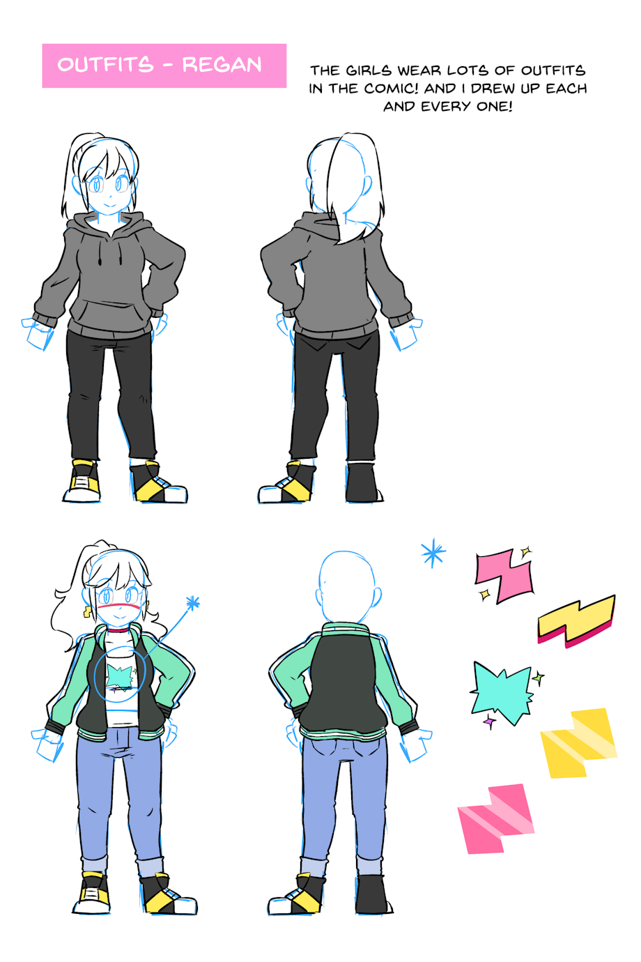 A bunch of Concept art from production back in 2017/2018 when the comic was made, i drew outfit turn arounds for EVERY outfit featured in the comic for the leads.