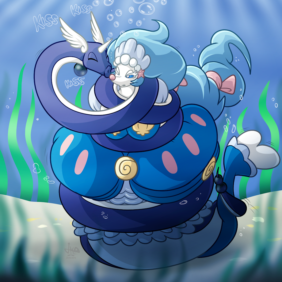 Her beauty has bewitched a nearby dragonair who couldn't help himself but smooch the primarina princess all over!