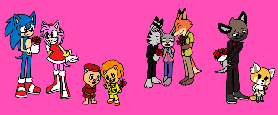 In this pic you can see Sonic, Disco Bear, Nick & Jack, and Haida giving a bouquet of flowers to their respective partners Amy, Pop, Judy, and Retsuko.