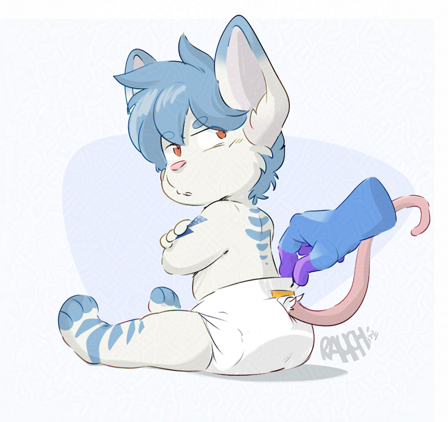Raguel looks back skeptically, ears twitching as mom adjusts his tail. She claims it's for comfort, but he's not buying it-this feels suspiciously like a diaper check... >.>