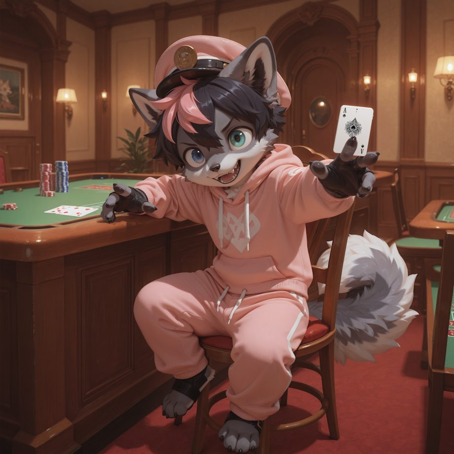 Pink hoodie, matching sweats, cap tilted just enough to say I’m relaxed, not careless. His fluffy husky tail curled lazily around the leg of the chair, swaying with each subtle shift of his mood. He looked like the most casual player in the room, but the stack of chips in front of him told a different story.