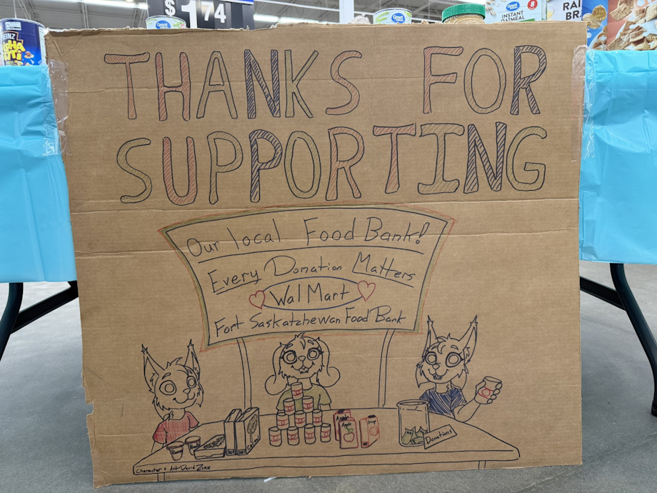 My store told me they wanted me to make a little poster board for our foodbank donations table. With no notice and only an hour, I scrambled to make a plan, get the supplies, and execute a very fast scene with all the right info on it.