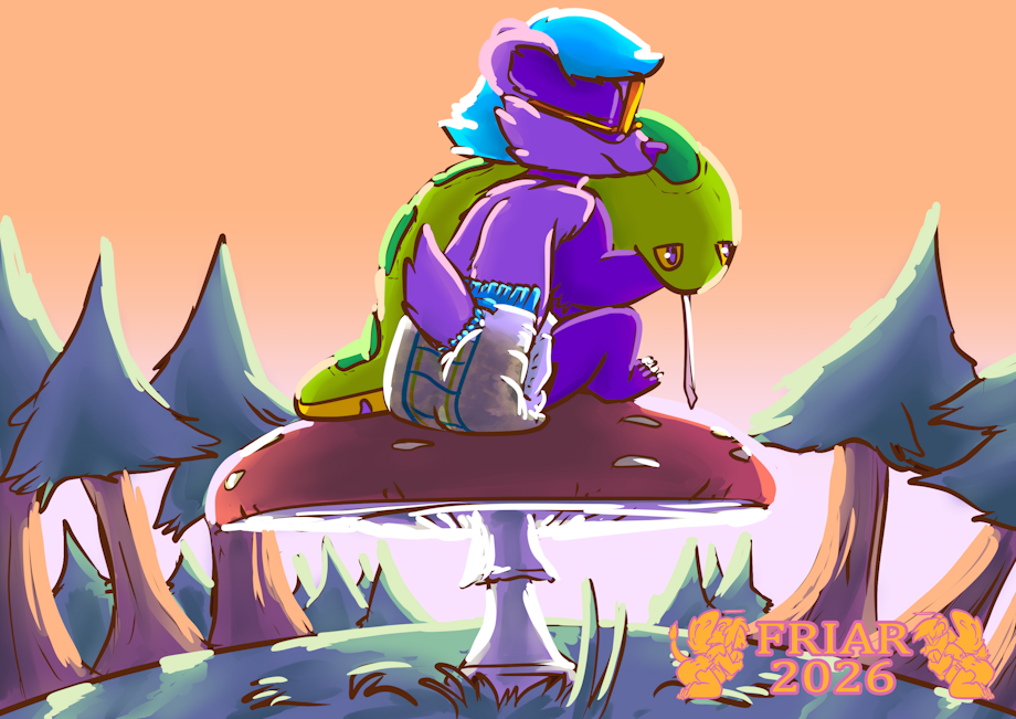 Illustration of Everett the badger seated nude upon a large Amanita Muscaria mushroom in the forest, holding his snake plushie and looking serene. Diaper versions included.