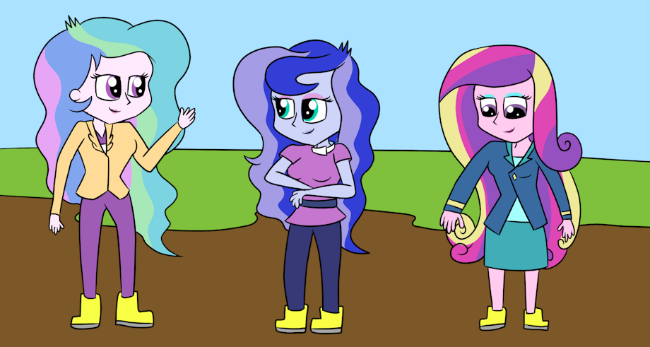 Principal Celestia, Luna and principal cadence in mud wearing pvc rainboots.