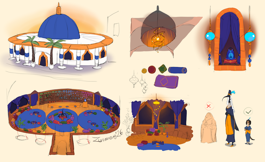 Something fancy and expensive; a place with something that makes it unique. That's when the genie lantern idea came, because what could make a place stand out more than a lantern with a real genie! Well, it's just a replica now, but still! At first it was just on a pedestal, but then we decided to give it a whole dedicated little shrine in the wall to make it look even more important than it already is.
