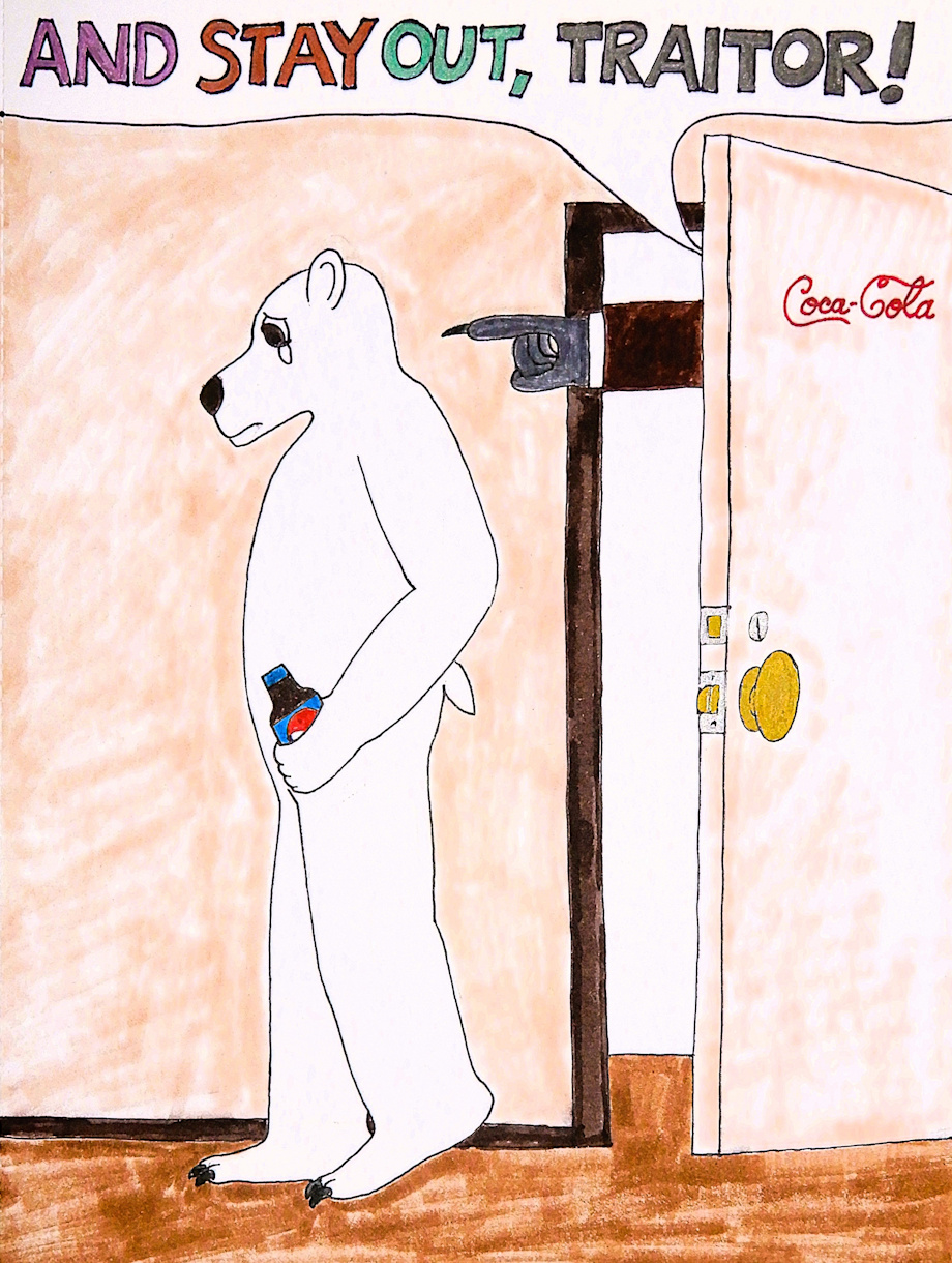Believe it or not, the Coca-Cola Company's polar bear mascot decided to participate in one of those "taste tests" to see if Coke really tastes better than Pepsi...and to his surprise, the Pepsi tasted better! http://www.youtube.com/watch?v=zFB_R2SwDb0 But when the staff spotting him sneaking the Pepsi cans and bottles into his lunches, the CEO had him fired on the spot! Now what's the jobless mascot to do, except humiliate himself in public by endorsing his new favorite drink?