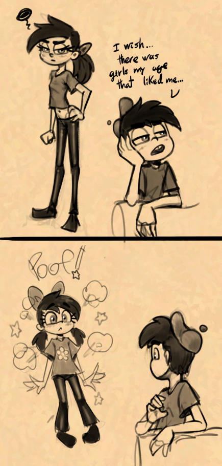 Well, is not the first time Timmy makes Vicky rejuvenates, but I like this idea this time she's her age, they would fall in love, and Timmy will have one of his break-outs because he's falling in love with the girl who makes his life misserable.