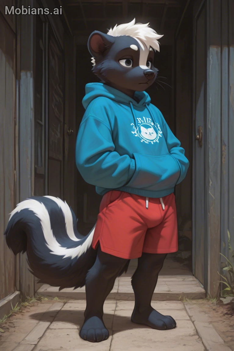 Blue hoodie and red shorts.