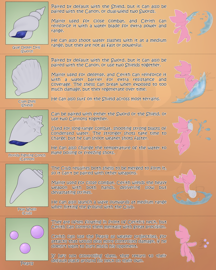 Sherro can transform his floating shells into different types of shells and conches to simulate different weapons, and the pearls around his neck can be used as an extra, less lethal melee weapon.